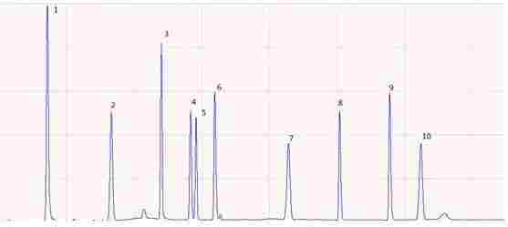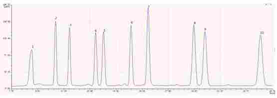 1,一溴联苯;2,二溴联苯;3,三溴联苯;4,四溴联苯;5,五溴联苯;6,六溴联苯;7,七溴联苯;8,八溴联苯;9,九溴联苯;10,十溴联苯; 图2.多溴联苯标准样品色谱图 1,一溴联苯醚;2,二溴联苯醚;3,三溴联苯醚;4,四溴联苯醚;5,五溴联苯醚;6,六溴联苯醚;7,七溴联苯;8,八溴联苯醚;9,九溴联苯醚;10,十溴联苯醚; 图3.多溴联苯醚标准样品色谱图 四、结 本实验采用高效液相色谱仪LC 310,方法稳定可靠,线性范围好,灵敏度高,可以对塑料制品中多溴联苯和多溴联苯醚进行有效的定性定量分析。 五、参考文献 [1] GB/T 37638-2019 塑料制品中多溴联苯和多溴二苯醚的测定 高效液相色谱法 |